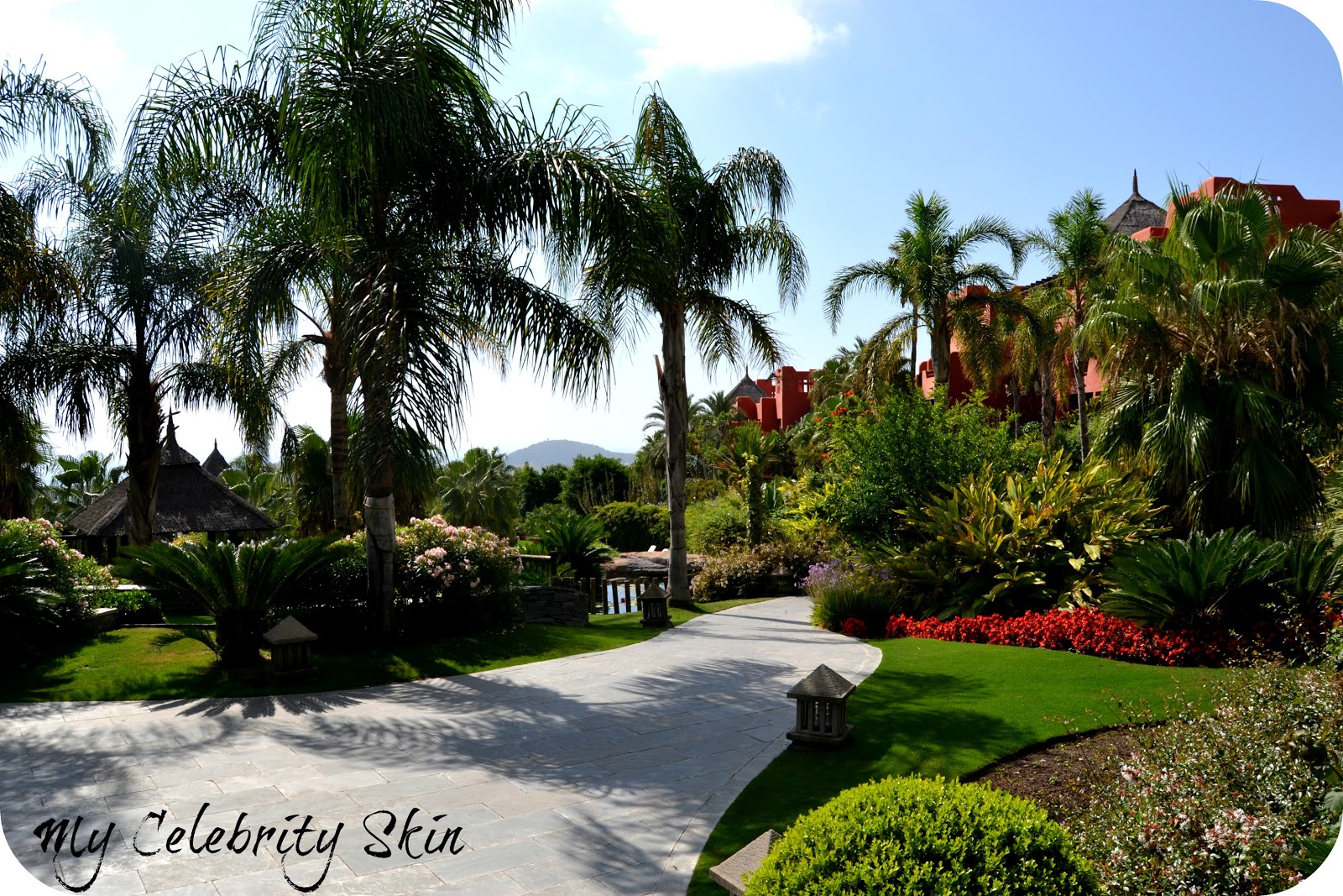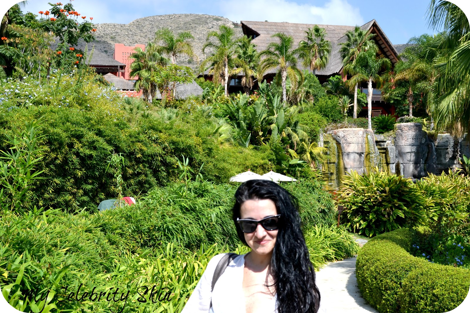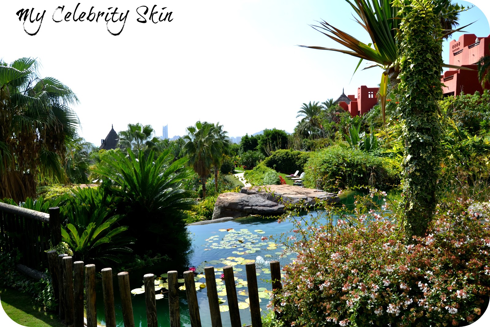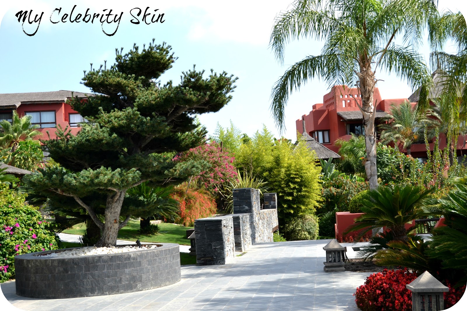 La vegetación del hotel es espectacular, jamás había visto nada igual, una variedad inaudita de plantas, perfectamente cuidadas, flores maravillosas con grandes corolas de colores vistosos. Un precioso y casi bicentenario árbol, Pinus Pentafila, traído de Japón y en forma de bonsái se descubre nada más acceder al exterior del hotel camino de sus piscinas, pero son muchas las especies curiosas de árboles que se pueden encontrar en sus jardines. Plantas de origen tailandés perfectamente adaptadas al clima mediterráneo, flores de temporada, estanques con peces de colores, todo unido con un verdísimo y cuidado césped que se riega con agua reciclada al igual que todas las plantas del complejo.