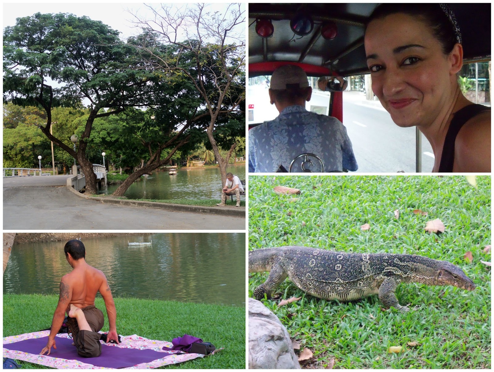Después de una mañana visitando templos, montar en tuk tuk y en ferry lo mejor era pasear y mezclarse con sus gentes, el parque Lumpini es lo mejor para poder relajarse y observar las costumbres de los tailandeses pero sobre todo de descubrir fauna que parecía impensable en un gran núcleo urbano. Por el parque campan a sus anchas unos enormes lagartos que en un principio me desconcertaron por el contexto en el que estaban, pero los tailandeses seguían tumbados en la hierba tan tranquilos, mientras semejante animal pasaba lentamente entre ellos. Había bastantes de estos lagartos, se bañaban en el lago, subían a los árboles y tomaban el sol en la hierba como si tal cosa, como si fueran palomas para los viandantes.