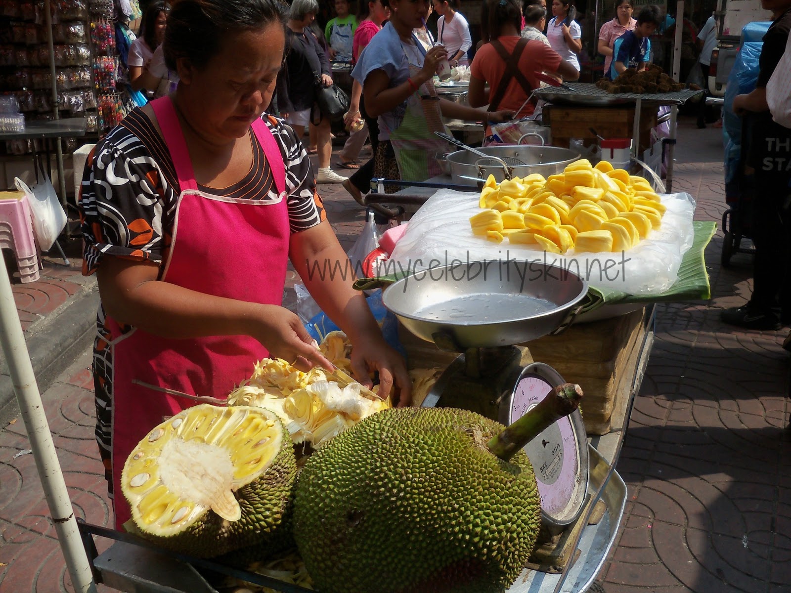 La comida de la calle es riquísima, es difícil caminar por las aceras porque están ocupadas con cientos de puestos de comida, bebida, ropa, accesorios… zumos naturales buenísimos cada dos pasos, lógico con todo el agua que pierde el organismo con ese calor y humedad. Aprovechad para probar frutas exóticas y deliciosos zumos tropicales. Una fruta muy famosa allí por su mal olor es el durian, prohibida en taxis, aeropuertos, hoteles… por su maloliente aroma, yo no la probé porque olía realmente mal pero decían que era una delicia.