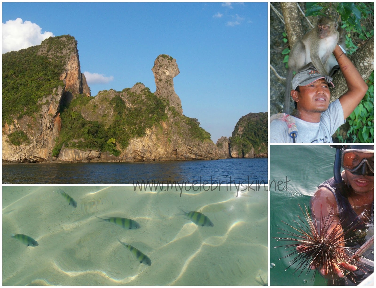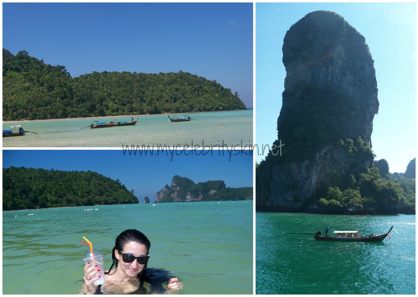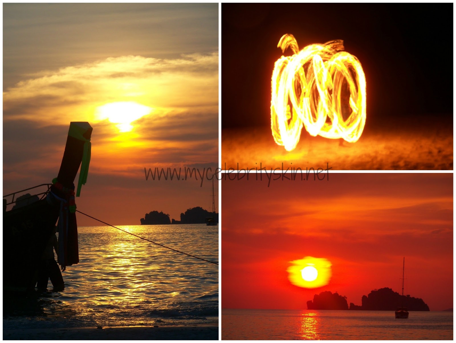 Salimos a medio día y el recorrido duraría hasta la noche. Nos bañamos en playas desiertas rodeados de peces de colores mientras los monos jugueteaban en la arena en Hong island, conocimos Chicken Island desde la barca, una isla con forma de pollo o eso dicen, cuello y cabeza sí parece que tiene. Hicimos snorkel en una cueva y después en un pequeño arrecife, vimos peces payaso, anémonas, peces de colores… una preciosidad. Vimos la puesta de sol en Tupac Island y cenamos una riquísima barbacoa en la playa mientras los gitanos del mar hacían danzas de fuego. La excursión ya había sido una verdadera maravilla pero aún quedaba lo mejor, había oscurecido y nos llevaron en barca cerca de Phra nang cave, allí pudimos hacer snorkel nocturno, que a priori puede dar un poco de miedo tan oscuro pero si habéis visto la película La Playa sabréis porqué me impactó tanto este momento. El plancton del mar es bioluminiscente, es decir, produce luz de forma natural, esto hace que al moverte en el agua entre la oscuridad se mueva la luz como si desprendieras miles de lucecitas de tu cuerpo, me cuesta mucho explicar el espectáculo tan maravilloso que vieron mis ojos, no quería volver a la barca, quería quedarme allí rodeada de luz, no dejéis de hacer snorkel nocturno porque es de lo más bonito y emocionante que he visto en toda mi vida.