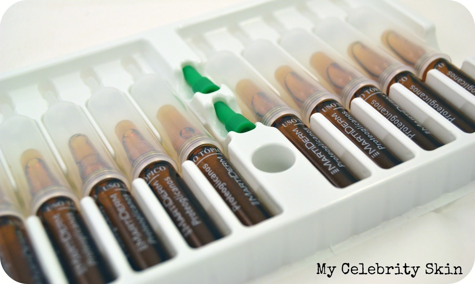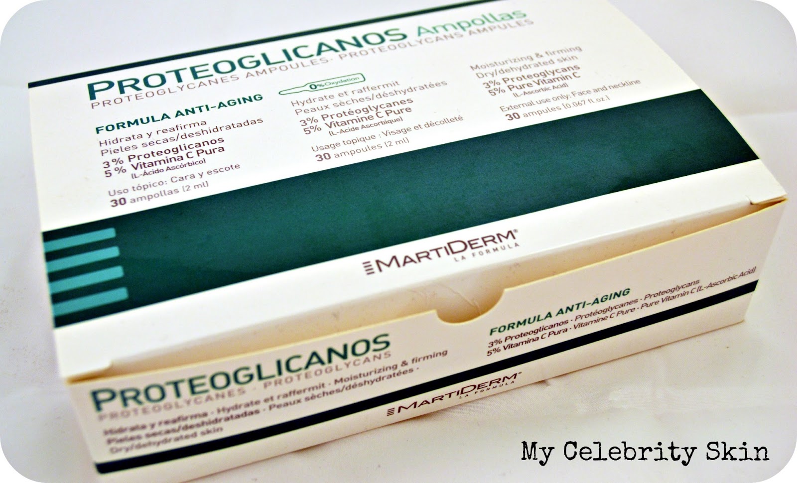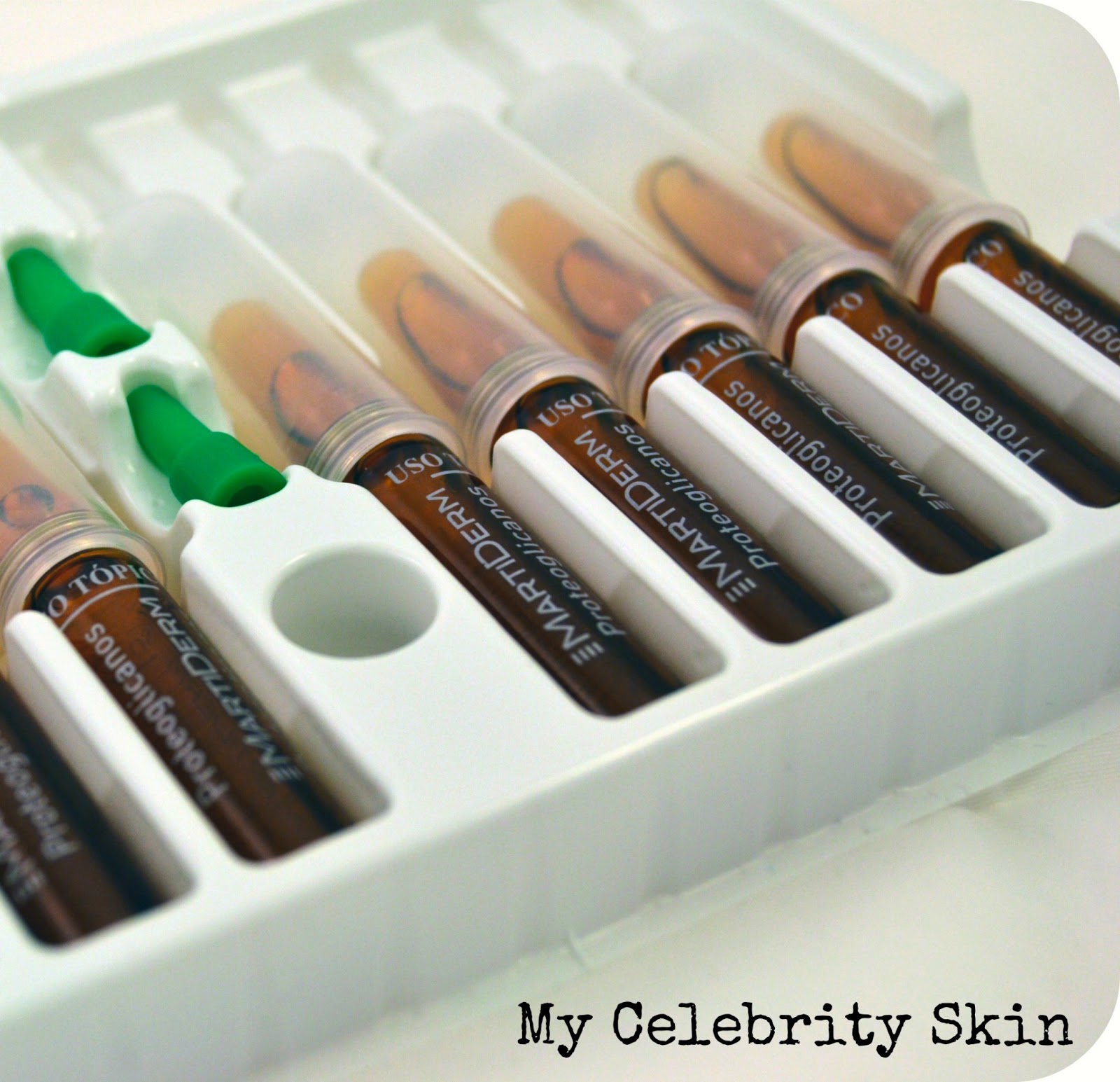 Hay tres tipos de ampollas de proteoglicanos en MartiDerm, las indicadas para pieles secas/deshidratadas (caja verde), las indicadas para pieles mixtas/secas (caja naranja), estas últimas llevan factor de protección solar, y las ampollas anti-age con un 15% de Vitamina C. También existen ampollas con liposomas para pieles grasas/reactivas.