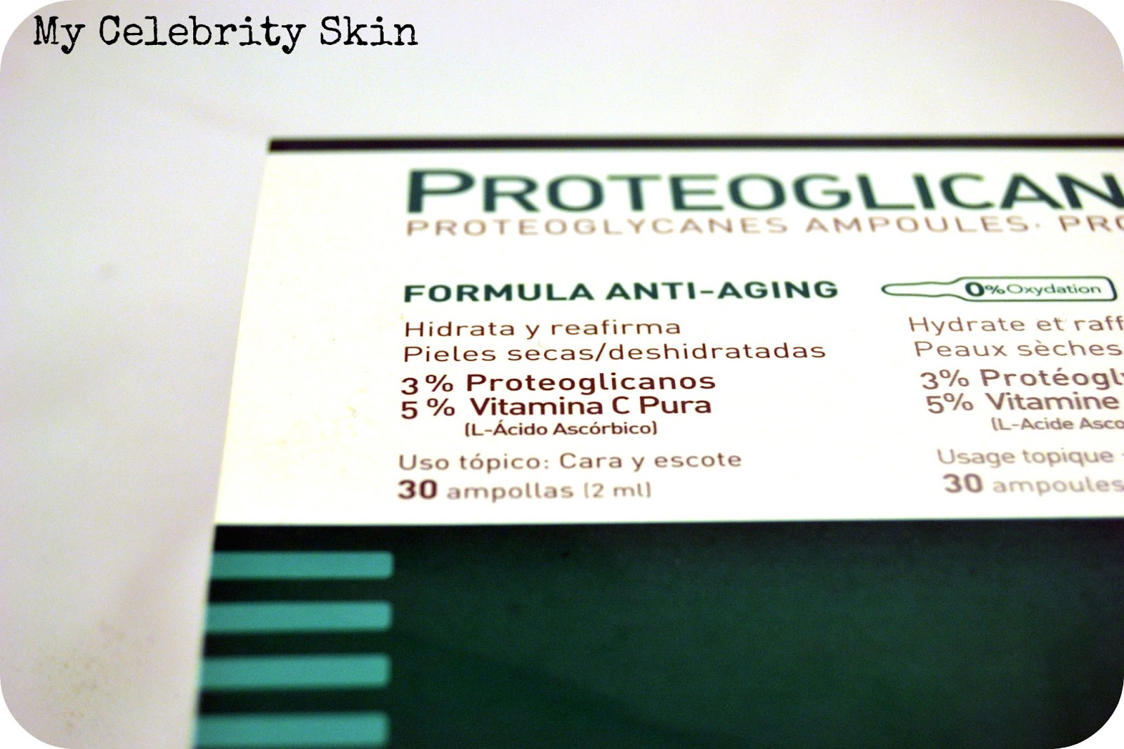 La caja grande contiene 30 viales de 2ml (también hay cajas de 10), el producto tiene un olor agradable y es oleoso, anaranjado. Yo solo he utilizado este tratamiento en la rutina facial nocturna, lo que hago es limpiar bien la piel y directamente aplico la mitad de la ampolla en el rostro, cuello y escote con suaves masajes. Lavo bien mis manos y dejo que el producto se absorba un poco, en mi caso no tengo que retirar el exceso porque mi piel recibe muy bien el producto, incluso al ratito me pide una hidratante. Los primeros días no apliqué ningún producto encima para ver los resultados pero en mi piel la combinación con una crema con un 10% de glicólico que estuve aplicando después es mucho más efectiva. Aplico la crema pasados unos minutos de la aplicación del tratamiento de proteoglicanos.