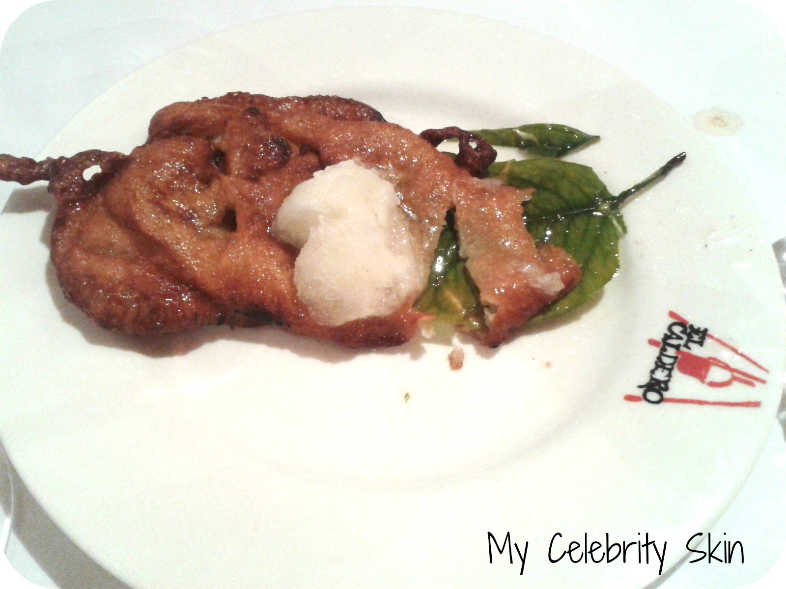 Como postre también quisimos probar los típicos paparajotes murcianos que son hojas de limonero rebozadas, fritas y flambeadas. Se sirven con helado de limón y son muy ricos y curiosos.